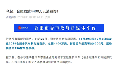 11月29日,,,,,据合肥宣布公众号显示,,,,,克日(11月29日)起至12月8日时代,,,,,将发放2024合肥市汽车新购消耗券,,,,,总额4400万元,,,,,新能源车最高可减6000元,,,,,运动共征集336家车企加入。。。。。。图片泉源:合肥宣布据相识,,,,,在加入运动的汽车零售企业处购... 11月29日,,,,,据合肥宣布公众号显示,,,,,克日(11月29日)起至12月8日时代,,,,,将发放2024合肥市汽车新购消耗券,,,,,总额4400万元,,,,,新能源车最高可减6000元,,,,,运动共征集336家车企加入。。。。。。图片泉源:合肥宣布据相识,,,,,在加入运动的汽车零售企业处购...