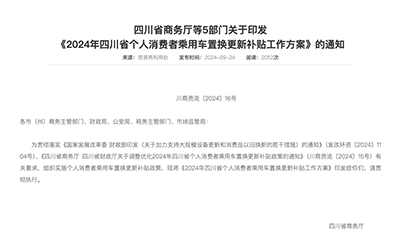 9月24日,,,,,四川省商务厅等5部分印发了《2024年四川省小我私家消耗者乘用车置换更新津贴事情计划》。。。。。该计划提到,,,,,自2024年8月26日至2024年12月31日,,,,,小我私家消耗者转让自己名下乘用车且在省内完成生意,,,,,并在省内购置新乘用车的,,,,,可申请一次性定... 9月24日,,,,,四川省商务厅等5部分印发了《2024年四川省小我私家消耗者乘用车置换更新津贴事情计划》。。。。。该计划提到,,,,,自2024年8月26日至2024年12月31日,,,,,小我私家消耗者转让自己名下乘用车且在省内完成生意,,,,,并在省内购置新乘用车的,,,,,可申请一次性定...